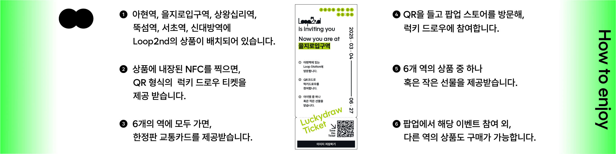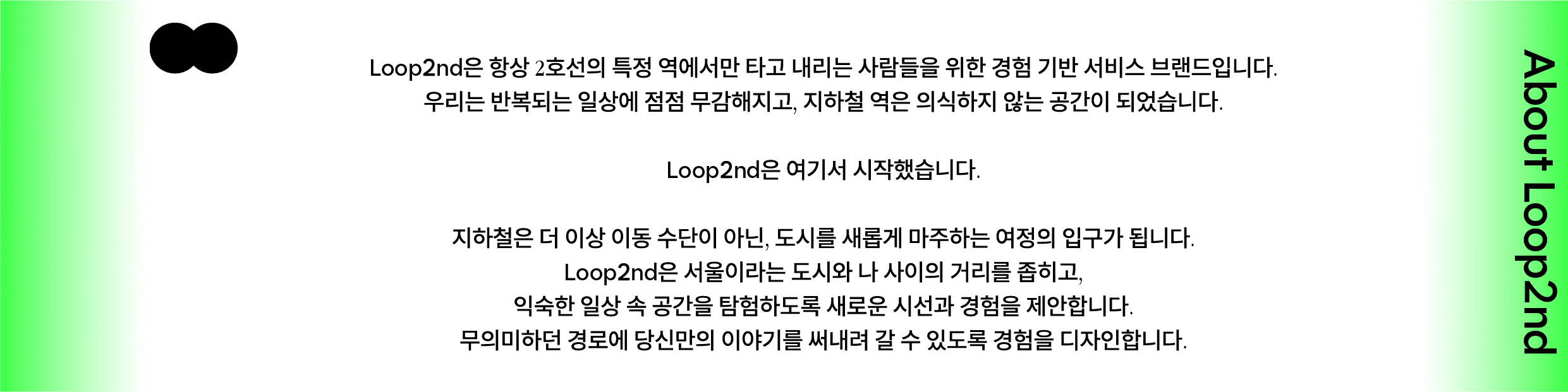 Loop2nd는 지루하고 반복적인 지하철을 색다른 경험의 장으로 바꾸는 브랜드입니다. 익숙해진 풍경 속에 숨은 이야기를 다시 발견하게 하고, 매일 지나치는 일상을 새롭게 바라보는 시선을 제안합니다.